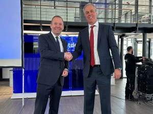 Handshake Philip Pfohe (Managing Director Hugo Pfohe) en Jurrie Scholtens (CFO Van Mossel Automotive Group)